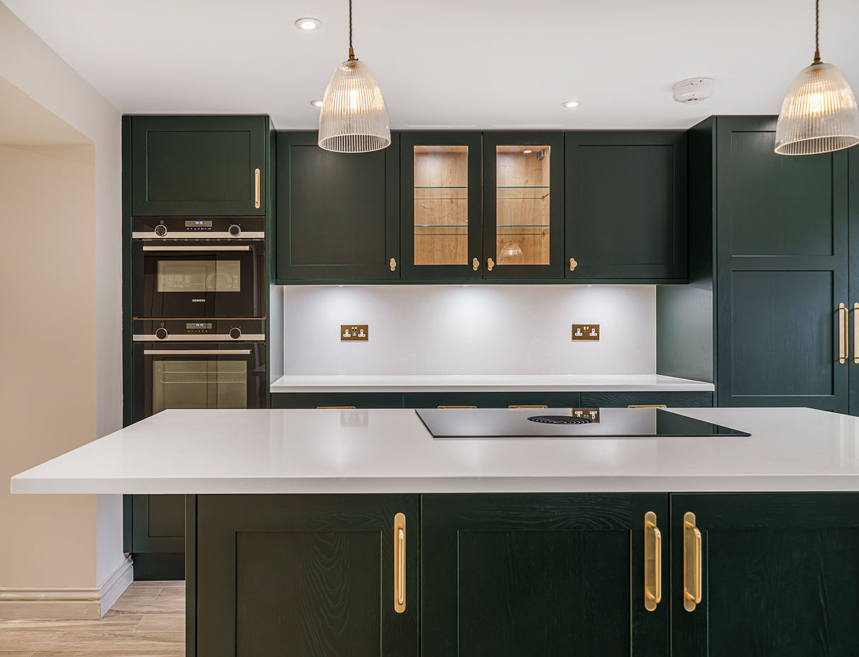 The design features a sophisticated five-piece ash shaker door style, finished in the elegant Obsidian Green by the Little Greene Paint Company. Complementing the cabinetry are durable and stylish 30mm quartz work surfaces. The kitchen is equipped with high-quality appliances from leading manufacturers, including Siemens, Bosch, and Bora, suggesting a focus on both performance and modern design.